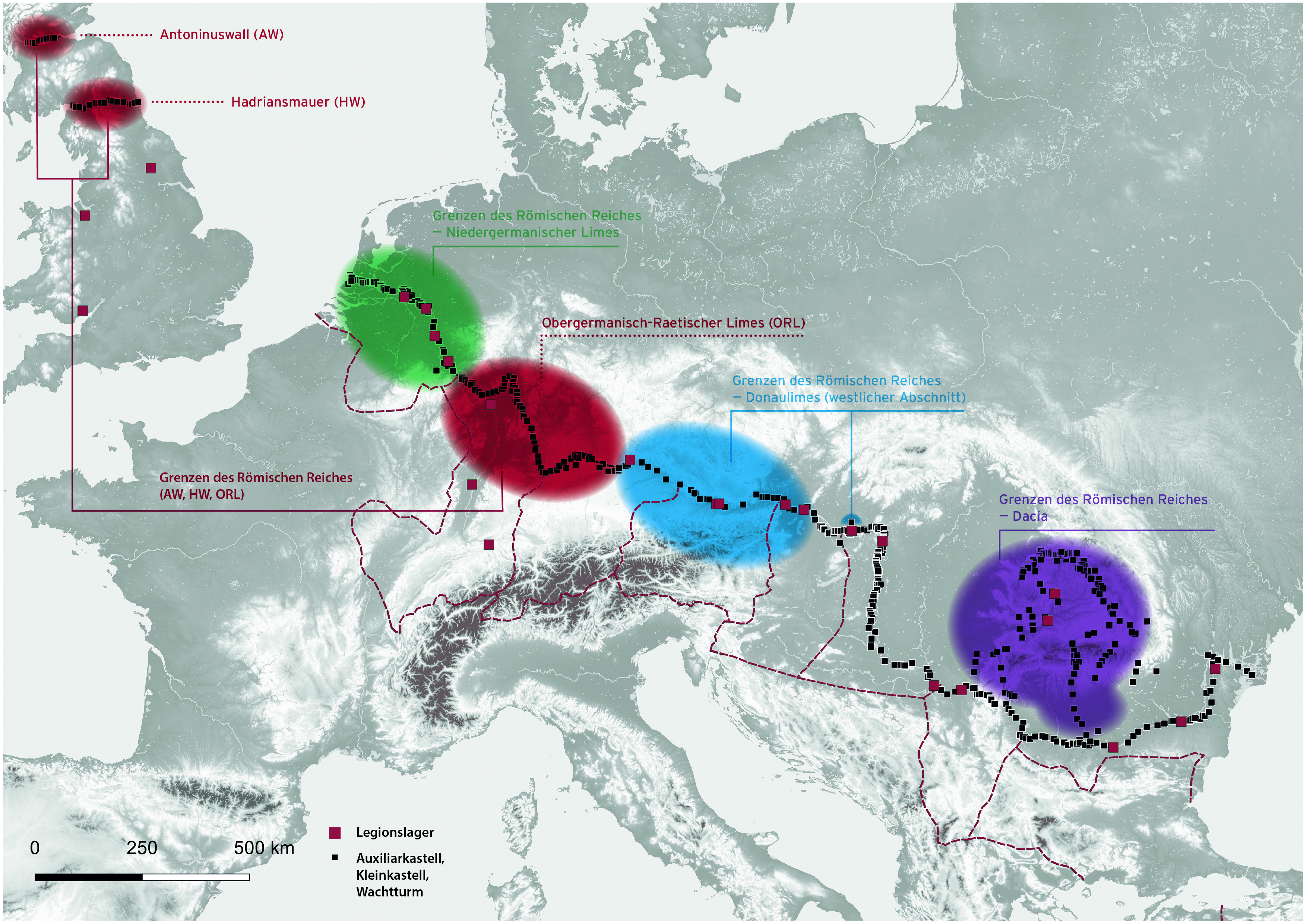 Verlauf der Grenzen des Römischen Reiches in Europa mit den aktuell eingetragenen Welterbestätten, den wichtigsten Militäranlagen und den Grenzprovinzen (DLK nach Vorlage von M. Polak).